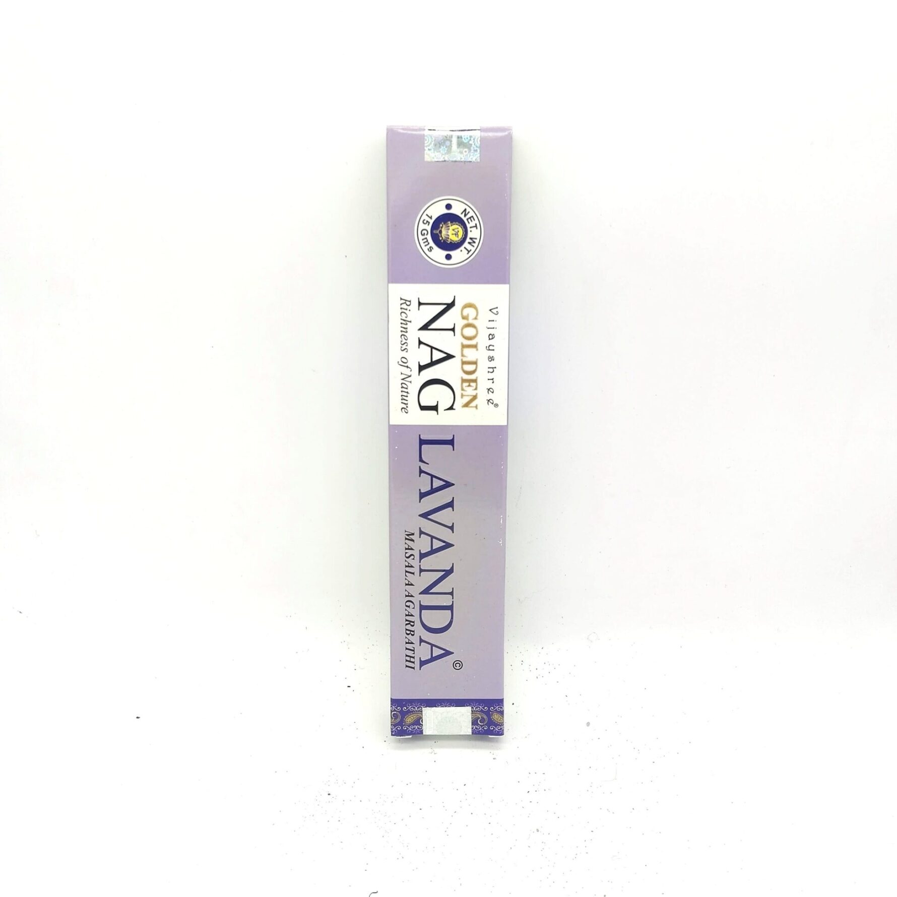 El incienso Golden Nag Lavanda de Vijayshree es una oda a la serenidad, elaborado mediante la técnica ancestral masala, donde resinas naturales y aceites esenciales se abrazan para crear una fragancia persistente y pura.